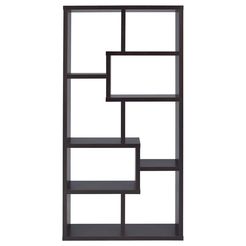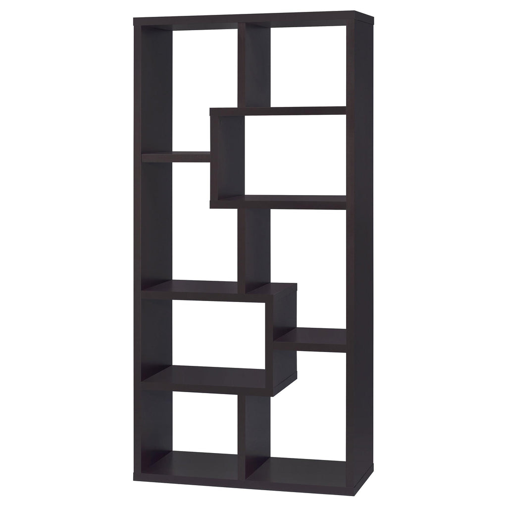• Geometric bookcase with a seemingly random pattern of boxes creates an attention-grabbing display for your favorite keepsakes and books