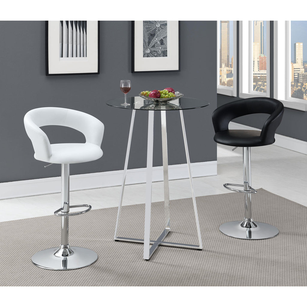 • This adjustable height bar stool boasts a black faux leather upholstered seat supported by a chrome base, radiating an enduring sense of style